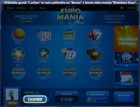 - Pritisnite gumb "Cashier" in nato pritisnite na "Bonus" v levem delu menija "Members Area".