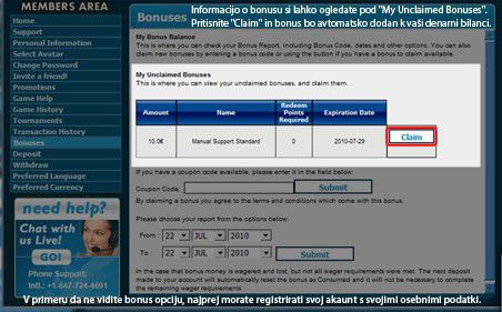 - Informacijo o bonusu si lahko ogledate pod "My Unclaimed Bonuses".