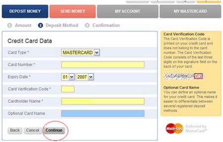Um Ihre MasterCard Informationen zu speichern, gehen Sie bitte auf das "My MasterCard" Feld.